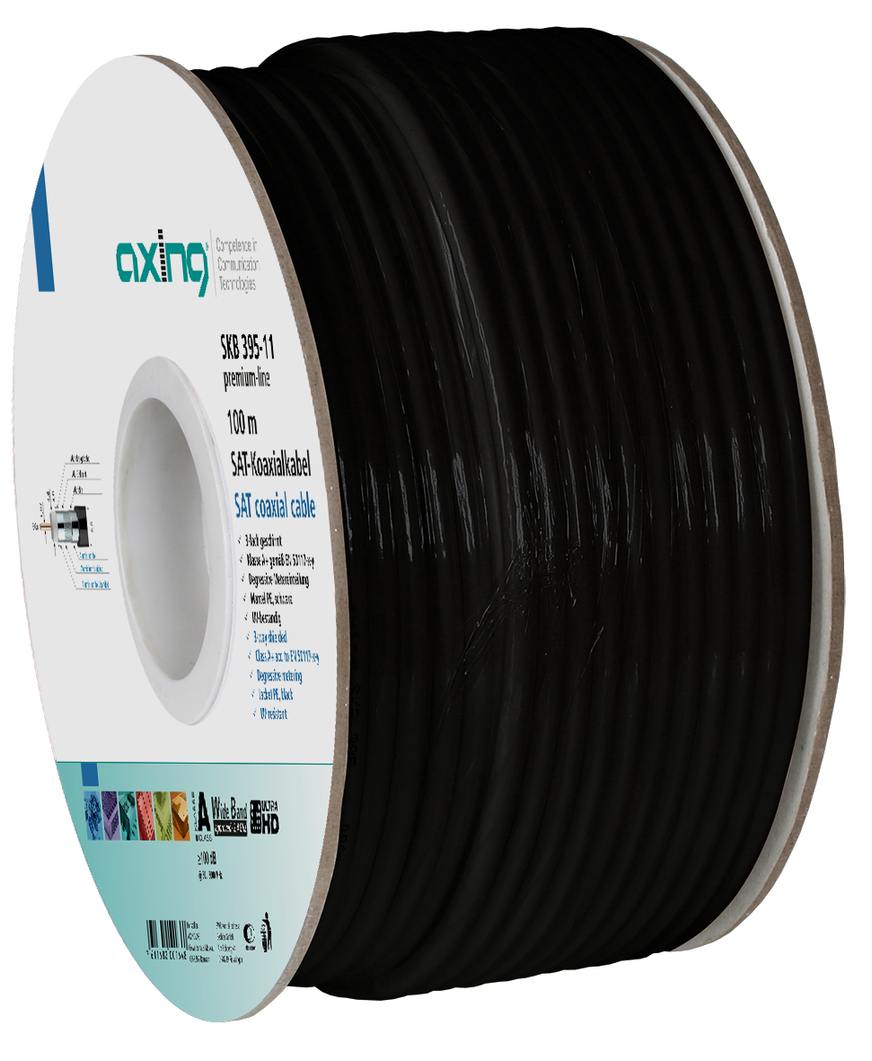 Erdverlegung nur im Schutzrohr, Koaxialkabel SKB395-11 3-fach geschirmt. Für SAT-/CATV-Hausinstallation Klasse A + 10 dB gemäß EN 50117-x-y Brandklasse Eca gemäß EN 50575 Innenleiter StCu, Durchmesser 1,02 mm Physikalisch geschäumtes Dielektrikum, Durchmesser 4,6 mm Schirmung Alufolie, geklebt/Alu-Geflecht/Alufolie Mantel PE, schwarz UV-beständig Degressive Metereinteilung. 100 m auf Pappkartonspule. Farbe: SCHWARZ