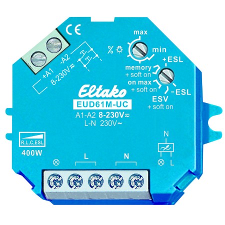 Eltako Multifunktions Universal Dimmschalter EUD61M-UC elektronisch für Einbaumontage 45mm lang, 55mm breit, 18mm tief, für R-, L- und C-Lasten bis 400W und dimmbare Energiesparlampen ESL bis 100 Watt, mit automatischer Lasterkennung abhängig von den Lüftungsverhältnissen, Kinderzimmerschaltung und Schlummerschaltung, Drehschalter für 7 Funktionen, automatische Überlastsicherung und Übertemperaturabschaltung, Schaltung im Nulldurchgang mit Soft-Ein und Soft-Aus zur Lampenschonung. Funkentstörung nach DIN-VDE0875, Kontakte: 1 Power MOSFET, Versorgungsspannung: 230V AC, Steuerspannung: 8 bis 230V UC, Nennschaltleistung: 400W , Stand-by-Verlust: nur 0,1W, Einschaltdauer: 100%, Fabrikat/Typ: Eltako EUD61M-UC