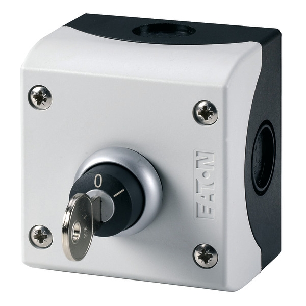 Eaton M22-WRS/KC11/I Schlüsseltaster 1S+1Ö 2 Stellungen Aufbau 216526 Komplettgerät, Schlüsselwahltaste, Schließung MS1, 2 Stellungen, rastend, Schlüssel abziehbar in Stellung I und O, mit Kontakt 1Schließer 1 Öffner, im Kunststoff-Aufbaugehäuse, System RMQ, Fronteinbau, Durchmesser 22.3mm, Cliptechnik, Frontringfarbe Titan, Schutzart IP67, 69K